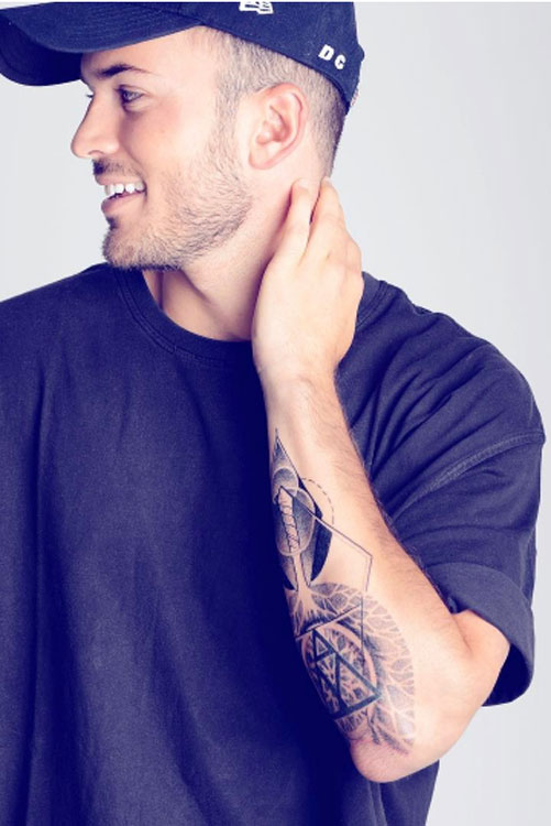 O David Carreira tinha tatuado um simples triangulo no braço esquerdo, mas decidiu aumentar a tatuagem e fazer um desenho bem mais elaborado como pode ver na foto.