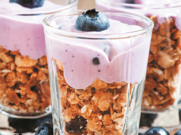 Distribua o muesli por 4 copos. Num copo misturador bata o iogurte com os mirtilos e verta sobre o muesli.