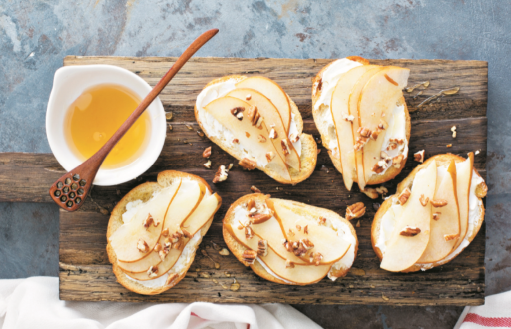 Receita de bruschetta com pera, queijo, nozes e mel