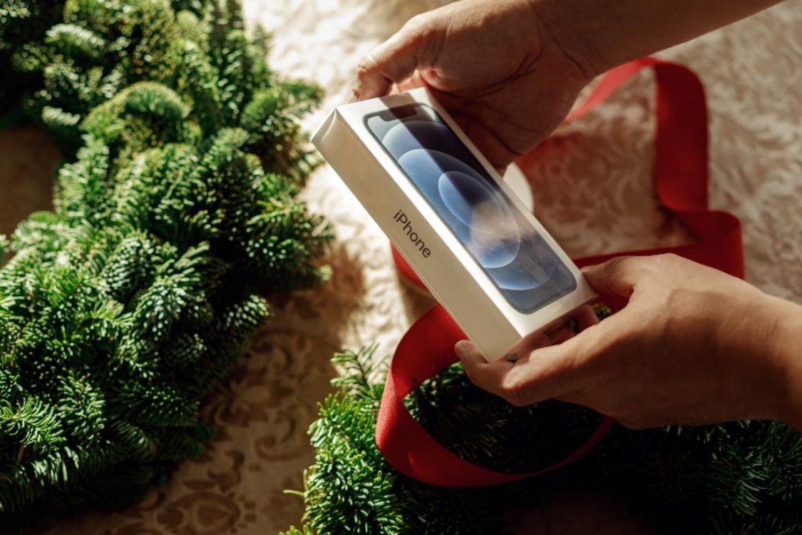 Com o Natal mesmo à porta, decidi presenteá-lo com uma oferta única: o novíssimo iPhone 12! É um telemóvel que conta com as mais diversas vantagens para os amantes de novas tecnologias. É o caso do processador mais rápido de sempre, num smartphone, o A14 Bionic! E há mais: o iPhone 12 destaca-se por ser protegido pelo Ceramic Shield, o que assegura uma resistência quatro vezes maior a quedas.